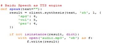 百度的文本转语音(TTS)引擎语音效果很好,其中的”spd”设置调节语速,vol调节音量,per选择人物,我们这里选择4号丫丫。在本程序中定义了一个speak函数完成这部分功能。